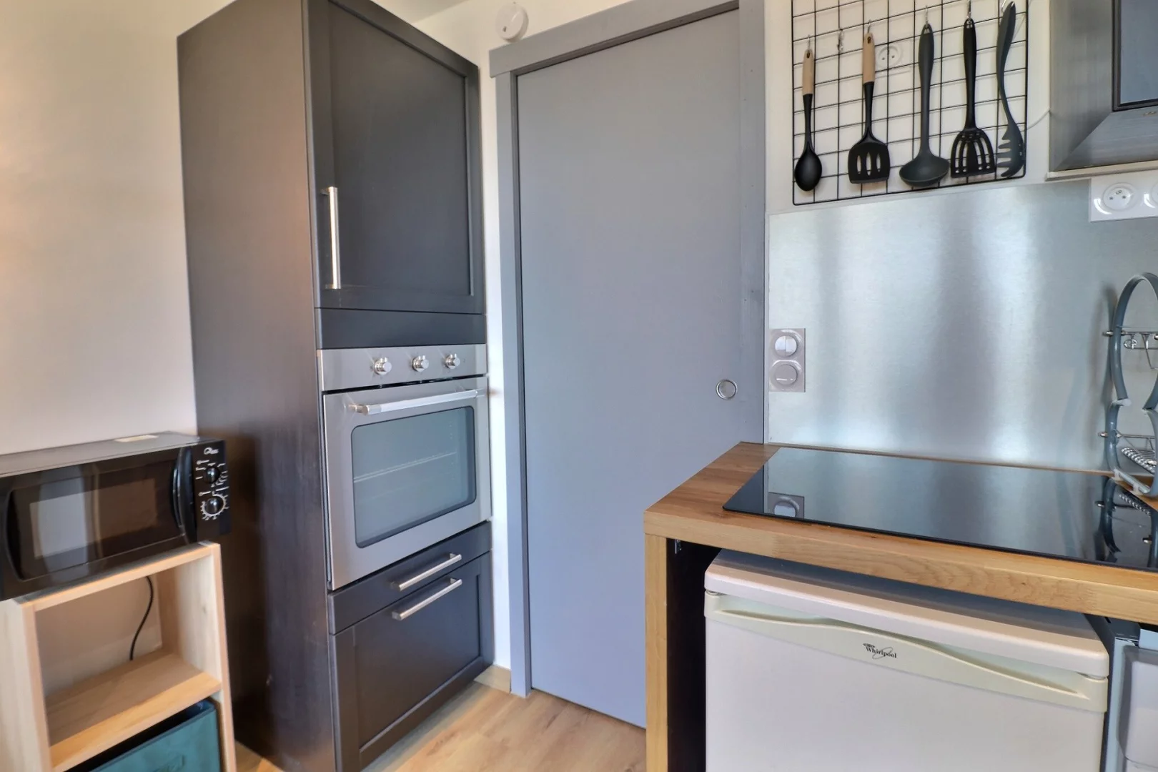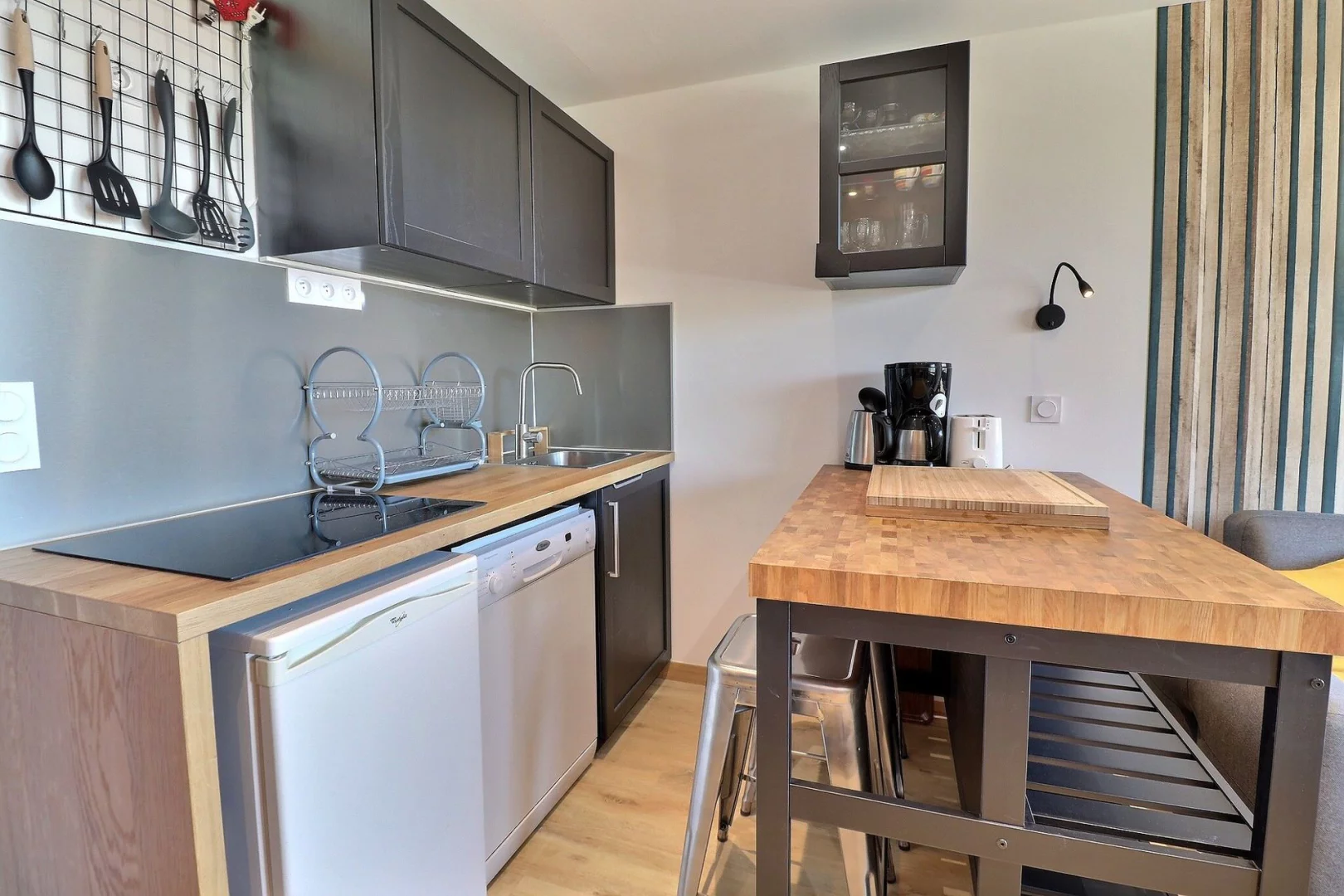 Cocina: 4 placas de inducción, nevera, horno, microondas, cafetera de filtro, tostadora, hervidor de agua,